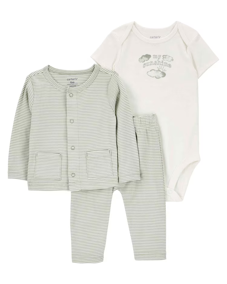 O Conjunto longo bebê 3 peças casaquinho listrado verde | Carter’s é ideal para o dia a dia e esbanja charme e fofura. Composto por um body de manga curta, um casaco de manga longa e uma calça com cós elástico, o conjunto é perfeito para o cotidiano dos papais e mamães pois os itens combinam perfeitamente entre si e também podem compor outros diversos looks. Seu bebê ficará confortável e estiloso. Invista!
