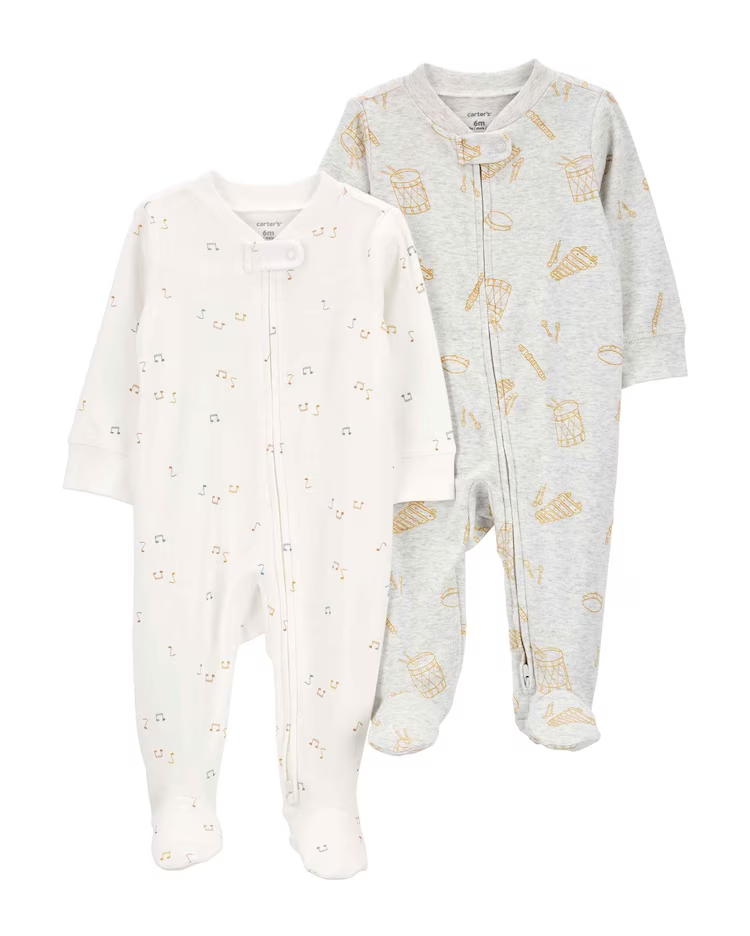 No ritmo da fofura! O Kit macacão bebê 2 peças instrumentos e notas musicais multicor | Carter’s feito de algodão, unissex, possui dois macacões com fechamento por zíper inverso com martingale, protegendo os dedinhos de seu baby, com pezinho e estampado com notas e instrumentos musicais. Ele ficará ainda mais charmoso. Aposte!